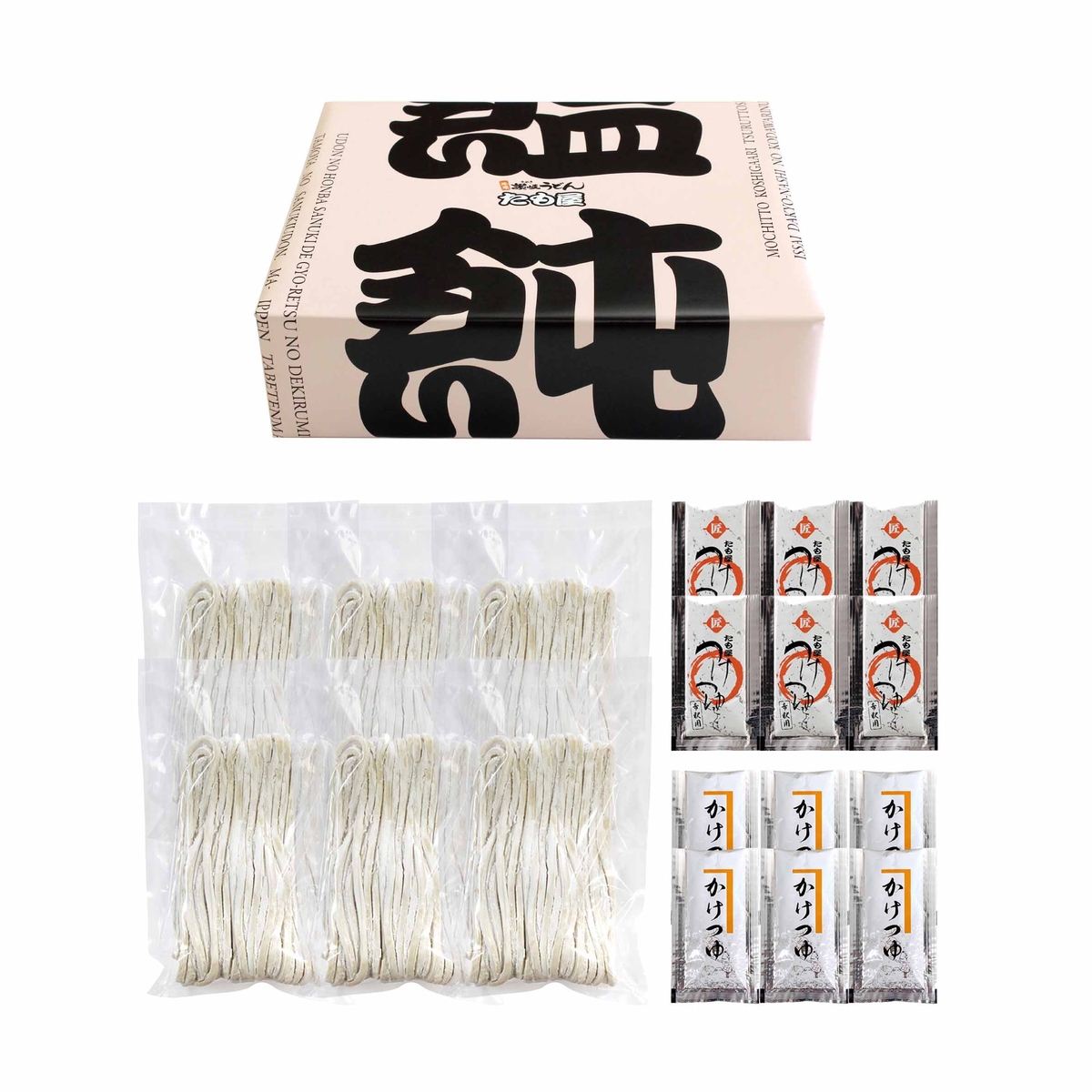 新しく改良した、たも屋の生うどんはより美味しさを追求、鮮度を優先、保存料不使用。消費期限は製造日から5日と短めですが、毎日お店で提供するうどん生地から製造し、即出荷いたします。小麦粉は独自に配合した「たも屋専用粉を使用し、かけつゆ・つけつゆは厳選したイリコ、鰹節の一番だしを使用した香り高い自慢の黄金だしです。完全自家製造の「こだわり生うどん」をぜひ、ご賞味ください。ご自宅用にも贈答用にもオススメです。