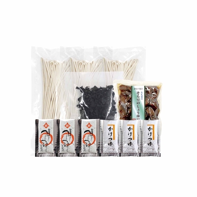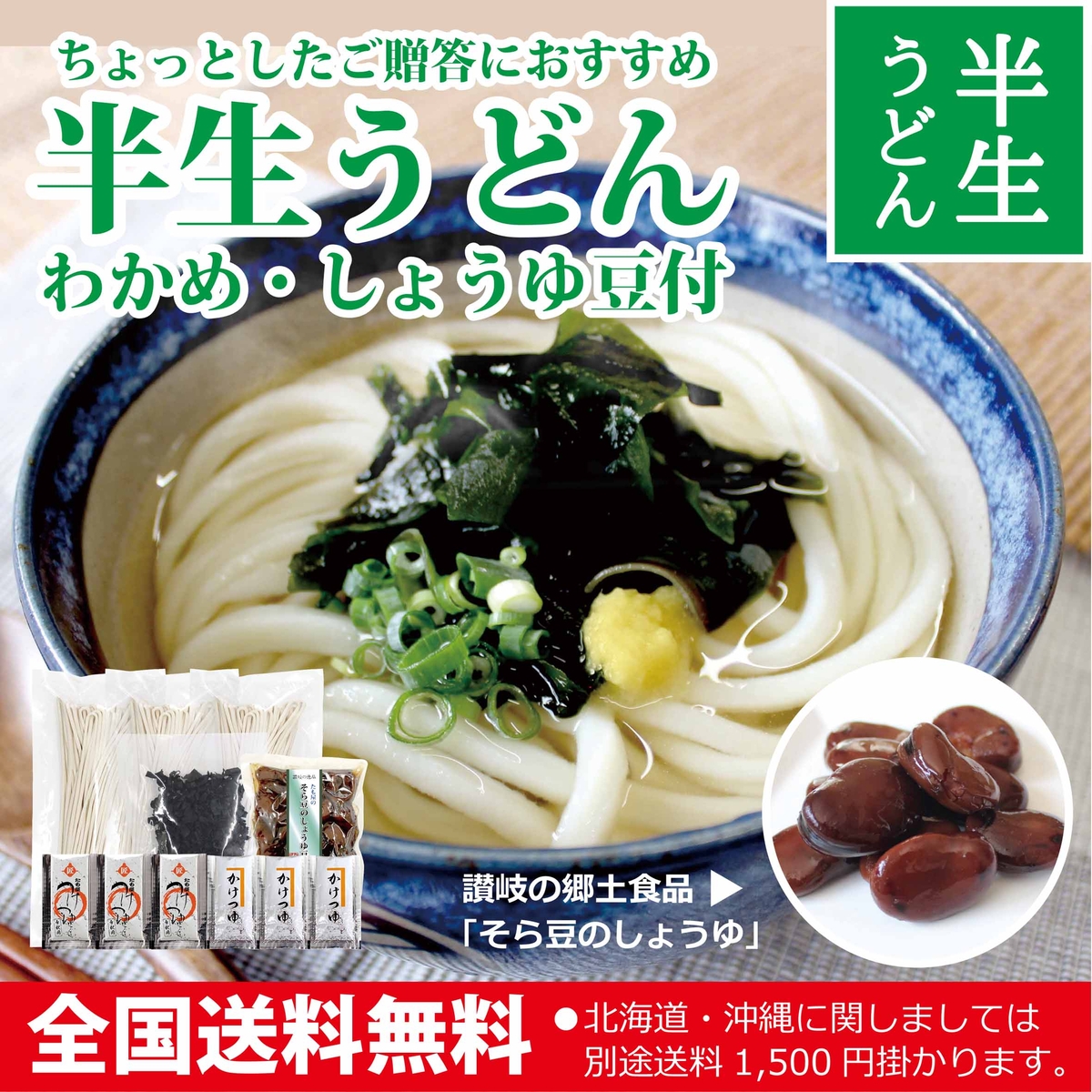 半生うどん、厳選したかけつゆ、つけつゆ、そら豆のしょうゆ豆、わかめがセットになりました。ちょっとしたご贈答におすすめです。